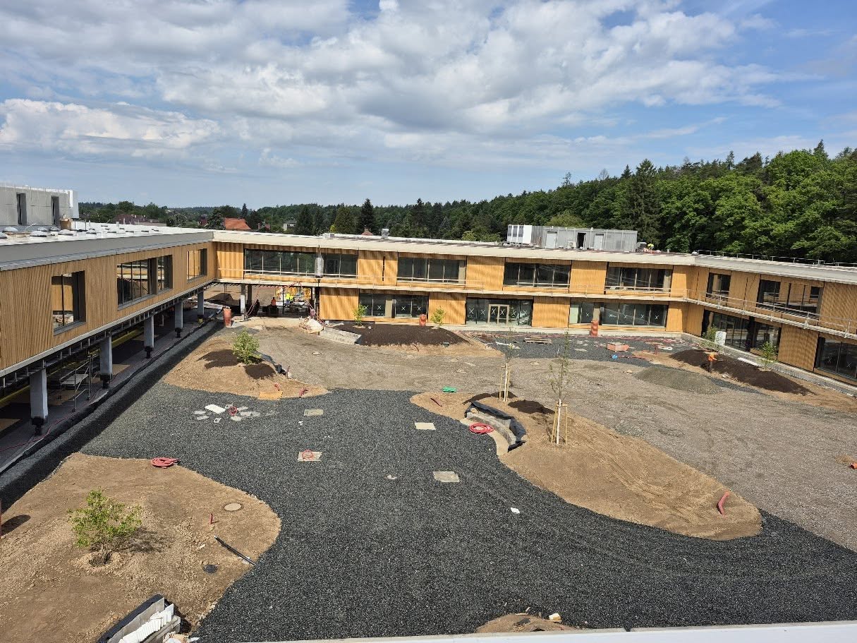 Ve vnitrobloku pak najdete tartanové hřiště, zóny klidu a vodní prvky. Atrium s přírodními prvky umožňuje žákům přímý kontakt s přírodou a slouží i pro environmentální výuku.