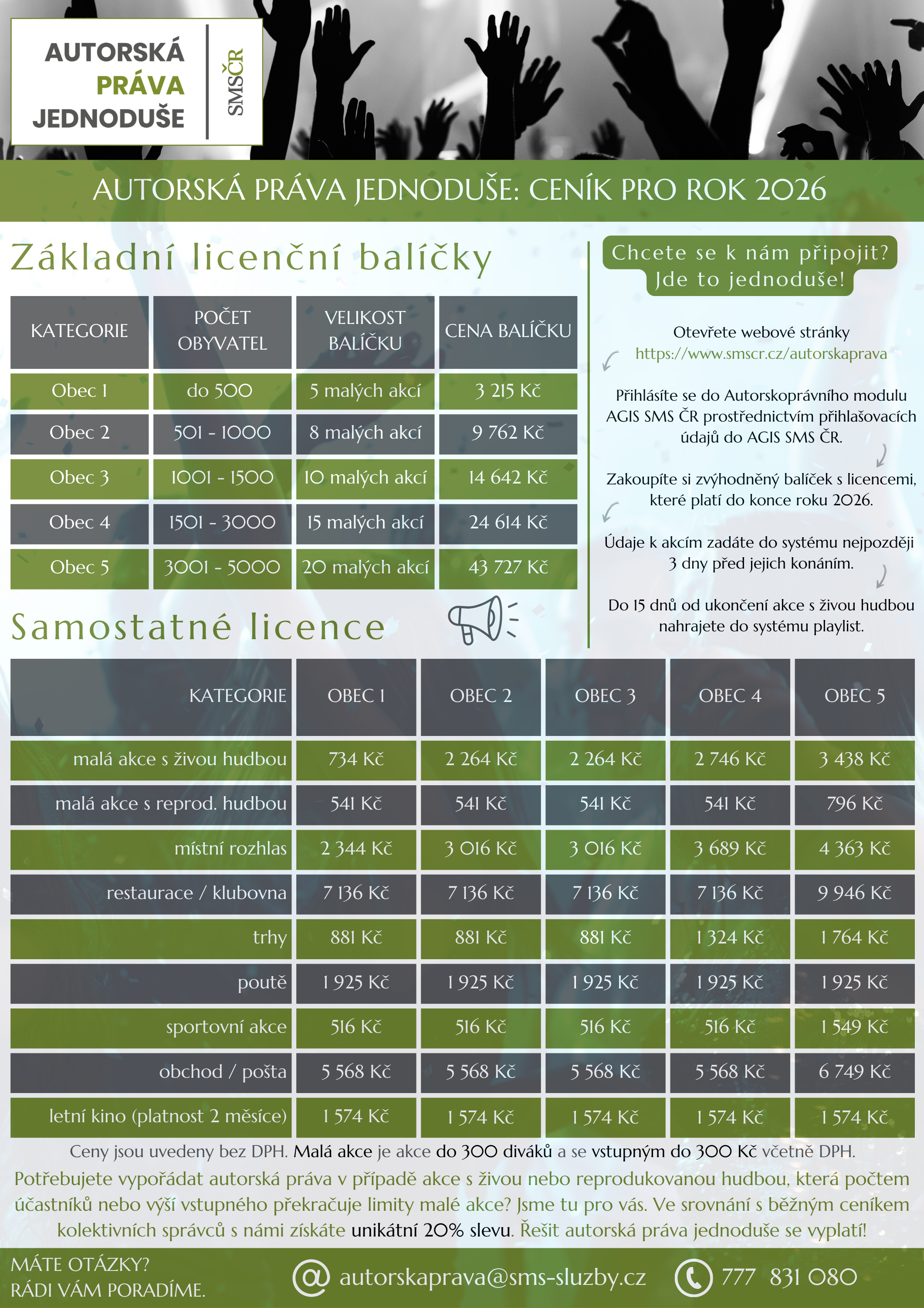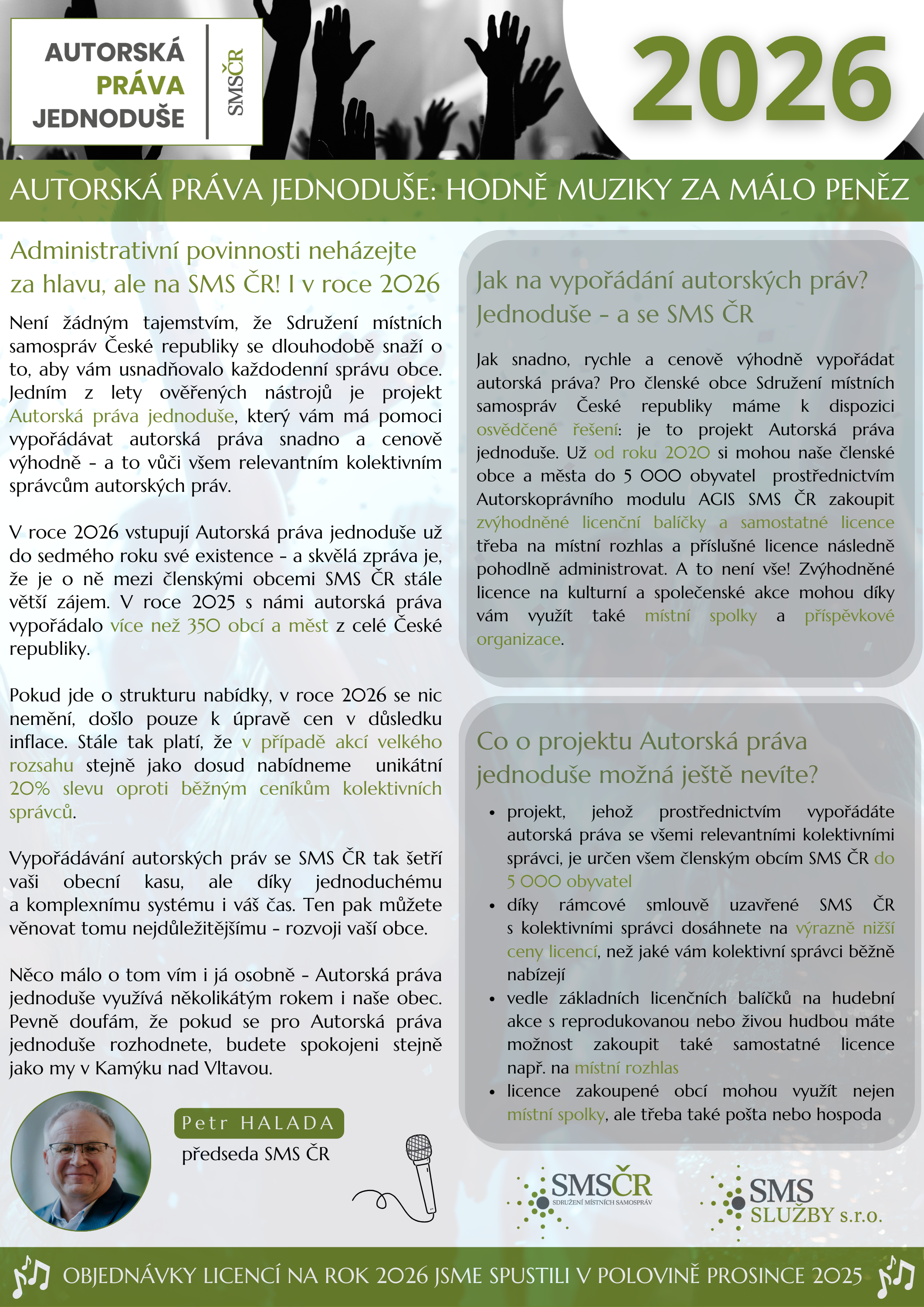 Ptáte se, v čem je služba výhodnější? Umožní jednoduché vypořádání autorských práv nejen členským obcím SMS ČR, ale také jimi zřizovaným příspěvkovým organizacím a neziskovým spolkům, které na jejich území sídlí. Cílem dohody s kolektivními správci je ulevit samosprávám od administrativních povinnos