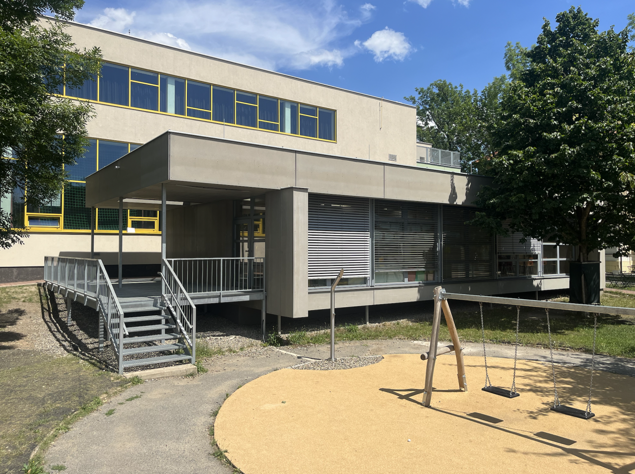 Venkovní učebna slouží prvňáčkům jako jejich kmenová třída, ale díky jednoduchému způsobu propojení může fungovat také jako větší společenská místnost. S velkými okenními plochami a střešními průhledy je zajištěna výborná světelnost, což vytváří příjemné prostředí pro výuku i společenské akce.